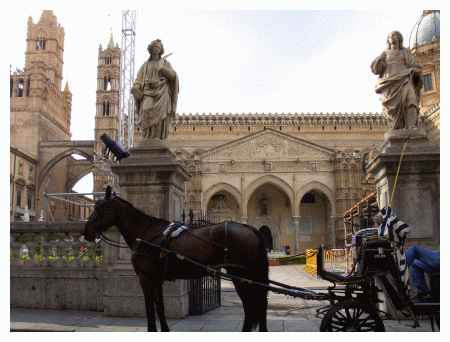 | Il ritorno alcune ore prima dell'imbarco. La cattedrale di Palermo con carrozzella.